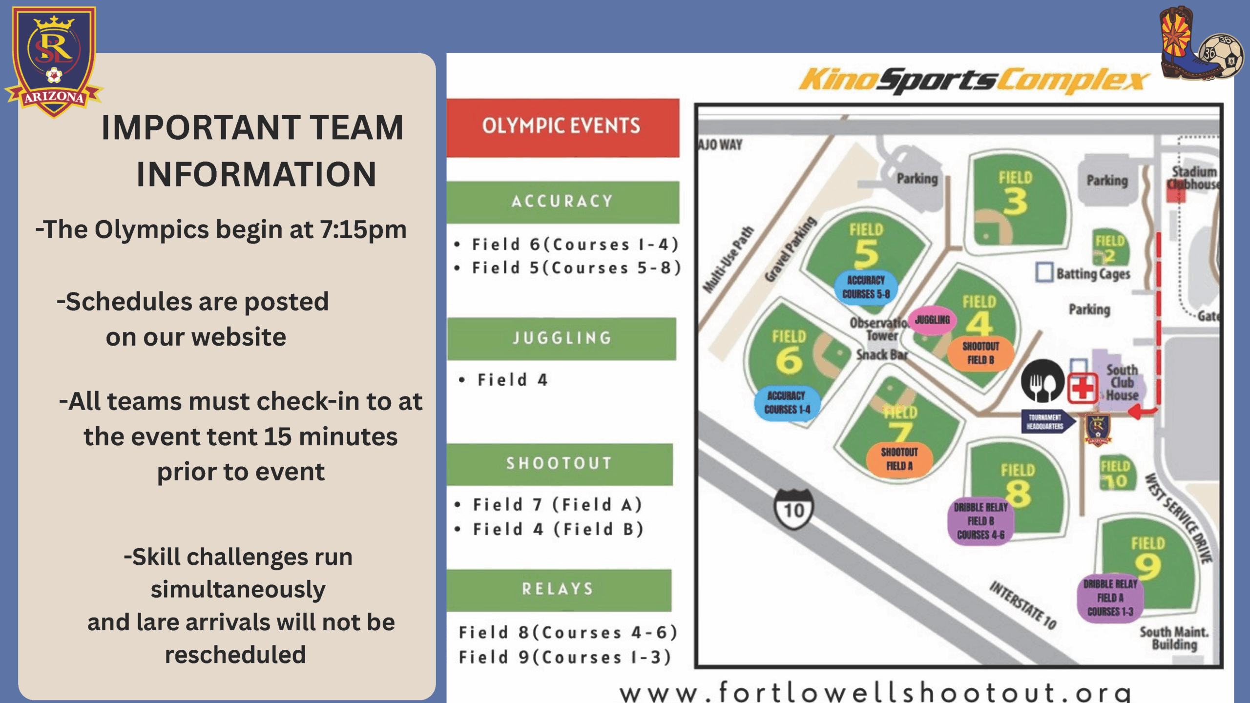The Soccer Olympics and opening ceremonies have been a part of the Fort Lowell Shootout Soccer Tournament since it was founded. The Friday night festivities include a parade, live music, food trucks, games/rides, and more. The big Friday Night event is the one of kind, Soccer Olympics. A fun and exciting way for young athletes to showcase their technical skills and abilities. All Olympics events will take place on Friday this year.